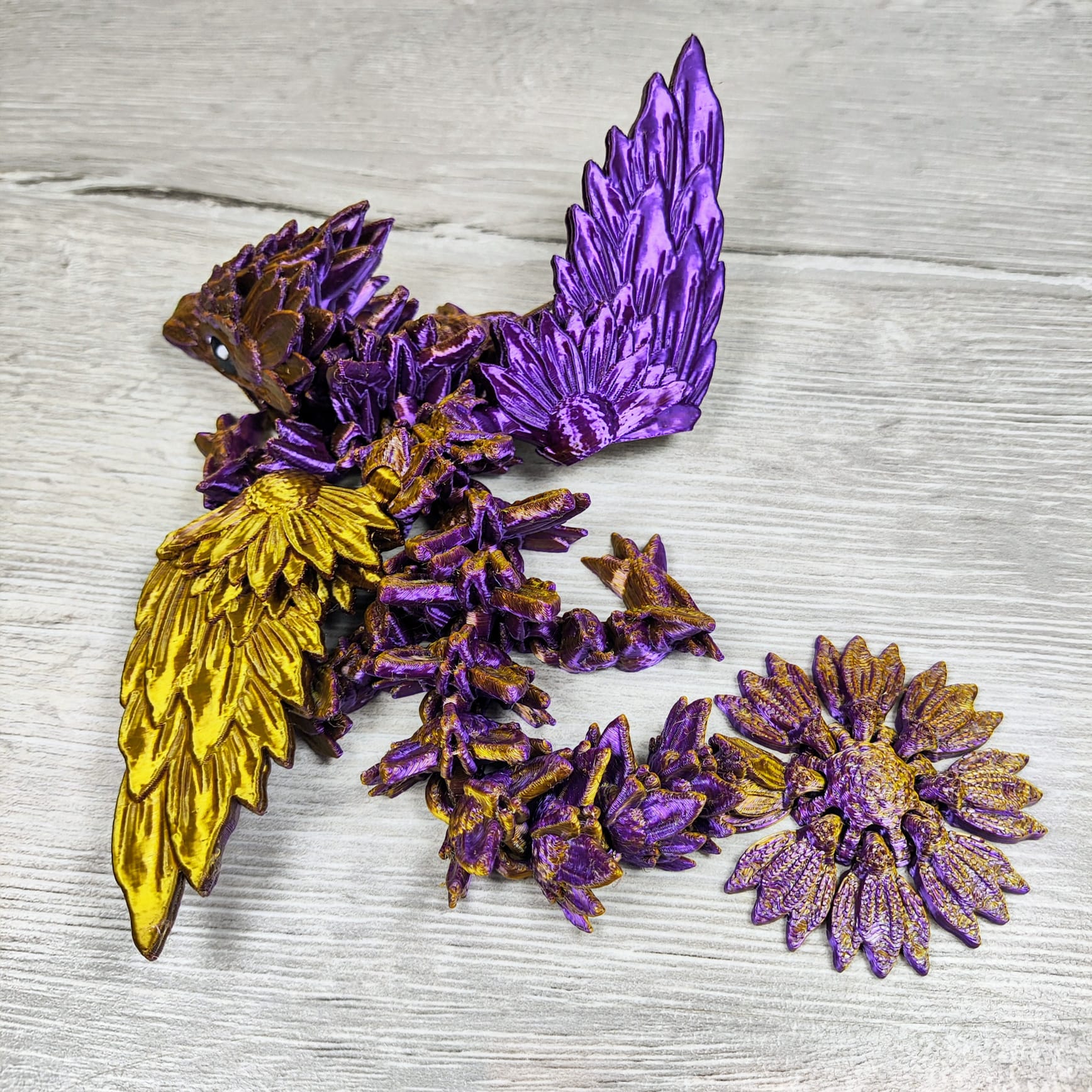 Bring a touch of nature’s charm to your collection with the Baby Sunflower Dragon, a delightful 3D-printed creation inspired by the beauty of sunflowers. With its enchanting wings and intricate details, this dragon perfectly blends whimsy and elegance. Measuring 23 cm long, with a 12 cm wingspan and a height of 7 cm, it’s a radiant addition to any fantasy lover’s display.