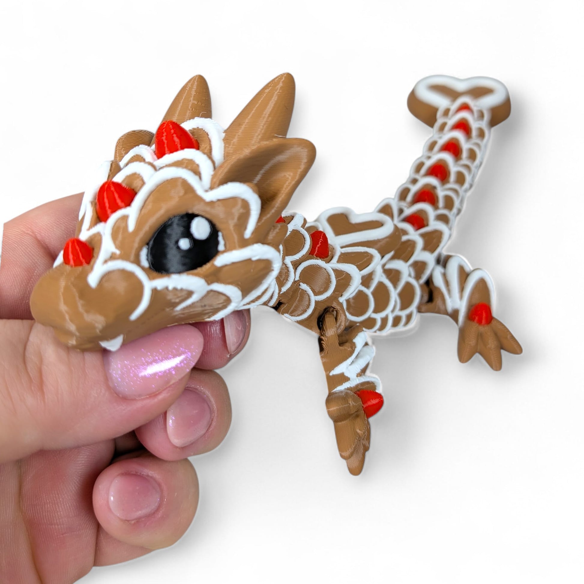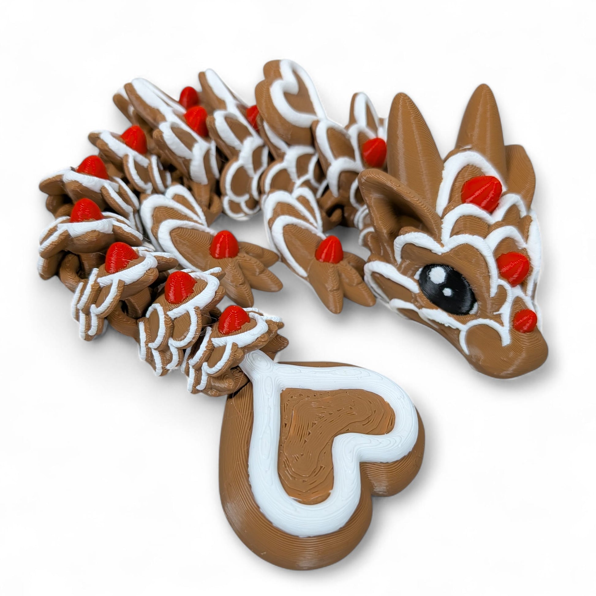 The Gingerbread Love Dragon is a sweet and magical Valentine’s Day dragon, blending cosy gingerbread charm with romantic heart details. Featuring delicate white icing-style accents, red candy decorations, and a heart-shaped tail tip, this dragon is made to celebrate love in the cutest way possible.